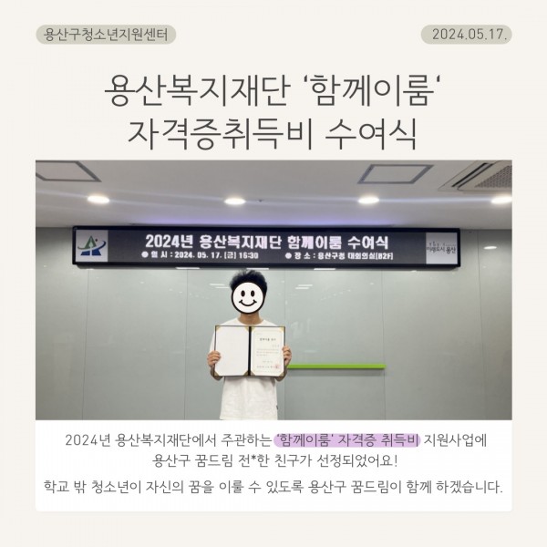 [꿈드림]용산복지재단 '함께이룸'자격증 취득비 수여식 페이지 정보 작성자 최고관리자 작성일24-05-20 09:05 조회3,761회 댓글0건 관련링크 이전글 다음글 목록 본문 2024년 용산복지재단에서 주관하는 ‘함께이룸’ 자격증 취득비 지원사업에용산구 꿈드림 전*한 친구가 선정되어 수여식에 다녀왔습니다.학교 밖 청소년이 자신의 꿈을 이룰 수 있도록 용산구 꿈드림이 함께 하겠습니다:)문의 02)3273-5827/ 카카오톡 ysyouth 댓글목록 등록된 댓글이 없습니다. 이전글 다음글 목록