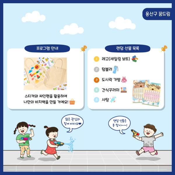 5차 아웃리치 '여름맞이 비치백 만들기' 홍보 페이지 정보 작성자 최고관리자 작성일23-07-17 13:00 조회5,358회 댓글0건 관련링크 이전글 다음글 목록 본문 장마와 함께 찾아온 여름!꿈드림과 함께 시원한 여름을 보낼 수 있도록올 여름 잇템인 '비치백 만들기 활동'을 준비했습니다.스티커와 싸인펜을 활용하여개성이 담긴 나만의 비치백을 만들고참가 후기를 작성해주시는 분들께는어마어마한 랜덤 선물까지!이번 활동은 학교 밖 청소년 인식개선을 위해꿈드림 친구들도 함께 참여할 예정이에요! 용산구 주민이라면 누구나 참여 가능하니많은 관심과 참여 부탁드립니다.감사합니다 :) 댓글목록 등록된 댓글이 없습니다. 이전글 다음글 목록