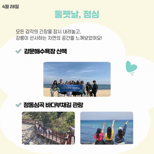 [2023년 직원 워크숍 후기] 페이지 정보 작성자 최고관리자 작성일23-05-03 17:22 조회6,021회 댓글0건 관련링크 이전글 다음글 목록 본문 안녕하세요용산구청소년상담복지센터입니다.지난 4월 27일~28일,1박 2일 워크숍을 강릉으로 다녀왔습니다!맑은 날씨 덕분에 충분한 휴식을 보내고 왔답니다 :)앞으로도 청소년의 건강한 성장을 위해최선을 다하는 용산구청소년상담복지센터가 되겠습니다! 댓글목록 등록된 댓글이 없습니다. 이전글 다음글 목록