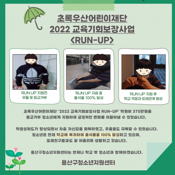 초록우산어린이재단 '2022 교육기회보장사업 RUN UP' 등교거부 청소년 학원비 지원 페이지 정보 작성자 최고관리자 작성일22-12-20 16:39 조회7,181회 댓글0건 관련링크 이전글 다음글 목록 본문 안녕하세요! 용산구청소년지원센터입니다.초록우산어린이재단 '2022 교육기회보장사업 RUN-UP' 학원비 375만원을 등교거부 청소년에게 지원하여 긍정적인 변화를 이끌어 낼 수 있었습니다.용산구청소년지원센터는 언제나 학교 밖 청소년과 함께 하겠습니다.#학교밖청소년 #초록우산어린이재단 #용산구 #용산구꿈드림 #꿈드림 #학습비지원 #지원 댓글목록 등록된 댓글이 없습니다. 이전글 다음글 목록