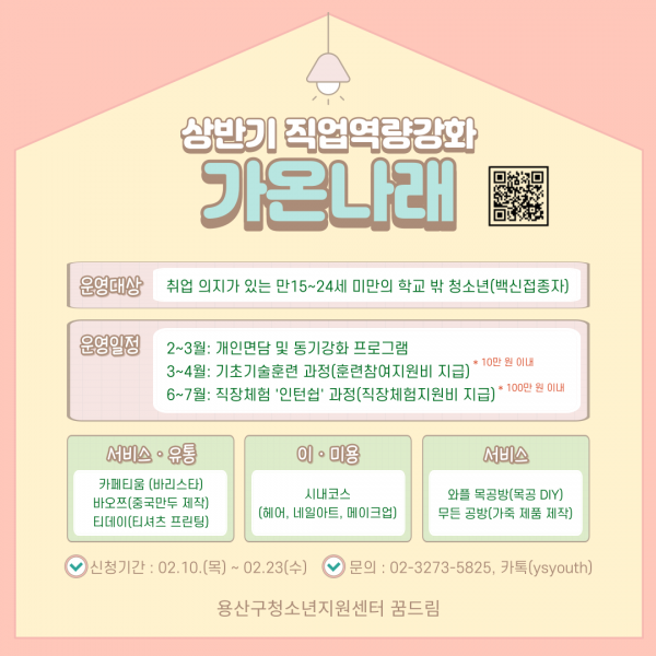 상반기 직업역량강화 프로그램 '가온나래' 참가자 모집 페이지 정보 작성자 최고관리자 작성일22-02-11 11:37 조회10,143회 댓글0건 관련링크 이전글 다음글 목록 본문 상반기 직업역량강화 프로그램 '가온나래' 참가자를 모집합니다!가온나래는 취업을 준비하고 있는 학교 밖 청소년을 대상으로다양한 분야의 직장 체험을 지원하는 프로그램이에요.성실하게 프로그램에 참여하면 훈련참여 및 직장체험 지원비도 지급받고진로탐색의 시간도 가질 수 있어요!가온나래와 함께 꿈의 날개를 펼칠학교 밖 청소년들을 기다리고 있으니많은 관심과 참여 바랍니다 :)-신청링크-https://forms.gle/ernJx2gs2J4PCkTt8 댓글목록 등록된 댓글이 없습니다. 이전글 다음글 목록
