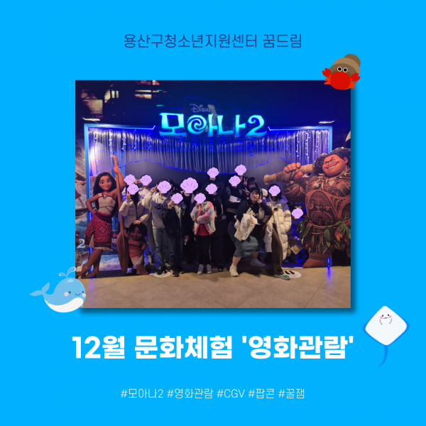 꿈드림 12월 문화체험 '영화관람' 후기! 페이지 정보 작성자 최고관리자 작성일24-12-03 16:49 조회2,392회 댓글0건 관련링크 이전글 다음글 목록 본문 올해 용산구 꿈드림 마지막 문화체험으로학교 밖 청소년 친구들과 함께 영화 '모아나'를 관람했어요.영화&팝콘&음료 필승 조합으로마지막 문화체험을 즐겁게 마무리할 수 있었습니다!2025년에도 다양한 문화체험을 진행할 예정이니조금만 기다려주세요. 감사합니다 :) 댓글목록 등록된 댓글이 없습니다. 이전글 다음글 목록